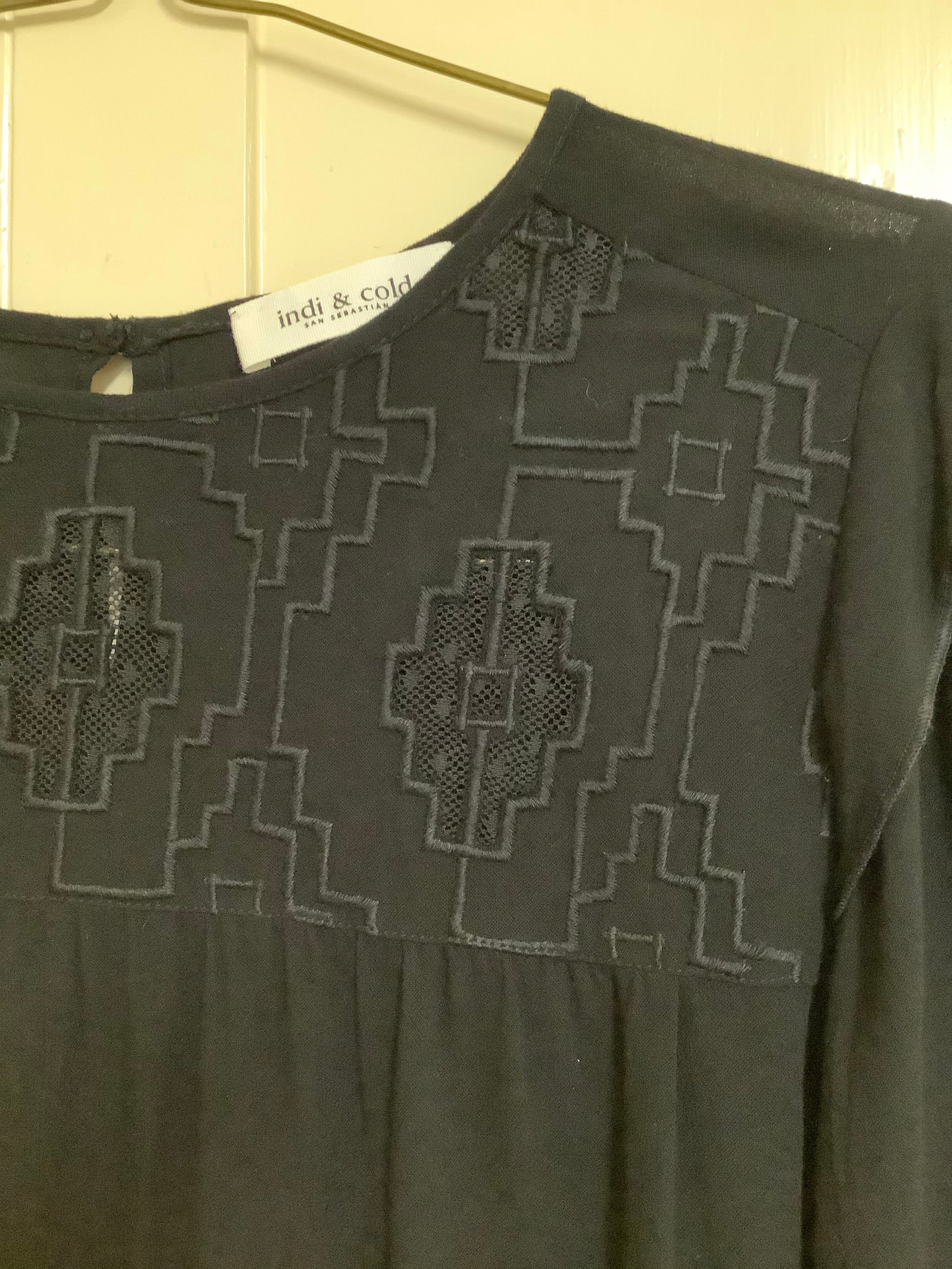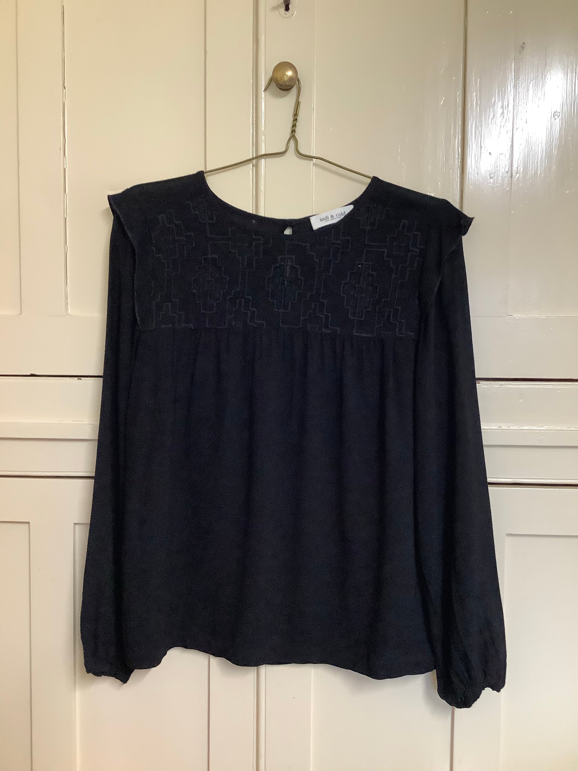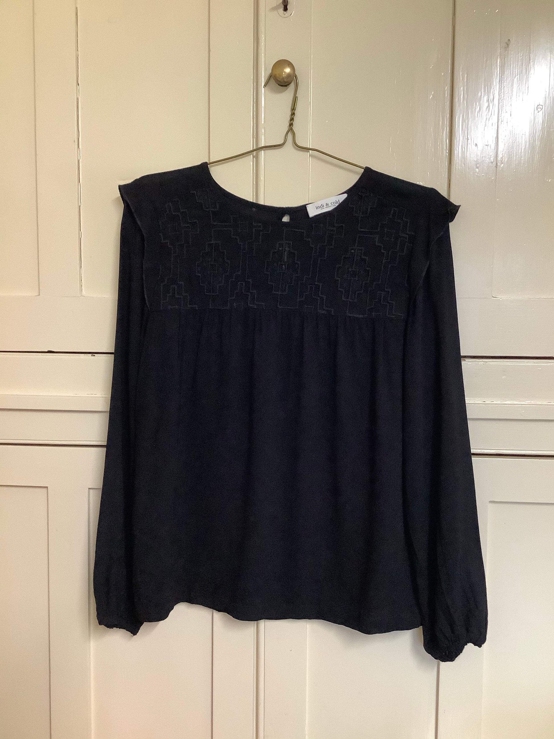 Esta fabulosa blusa de viscosa queda genial con jeans o se puede usar para una noche más elegante. Tiene un pequeño volante alrededor de las sisas y detalles de cortes en el canesú delantero. ¡Es una verdadera ganadora!