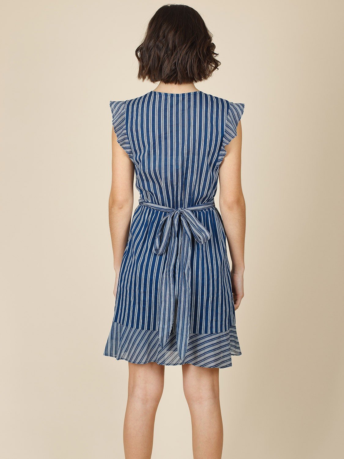 Un minivestido cruzado de algodón azul a rayas.