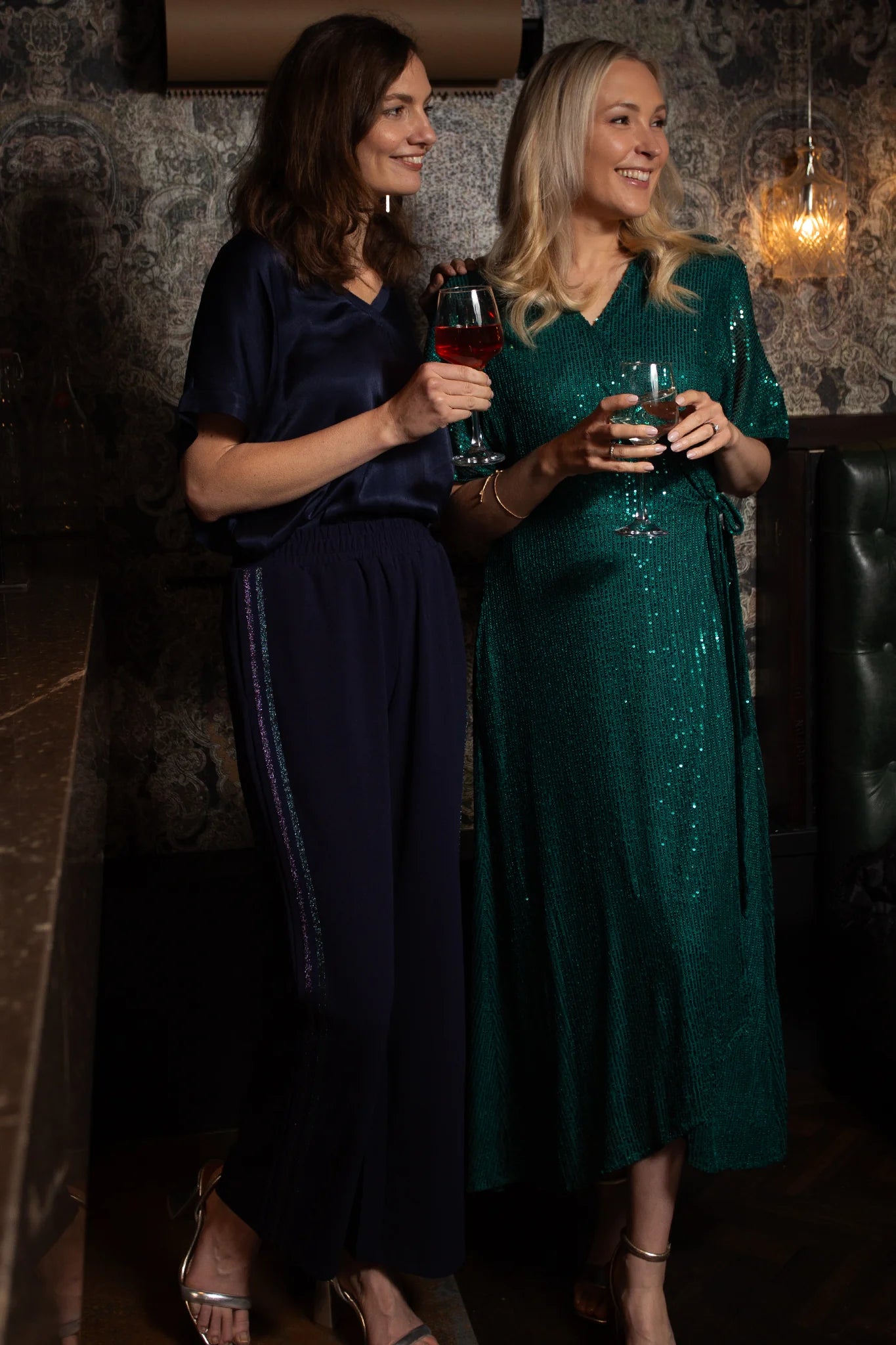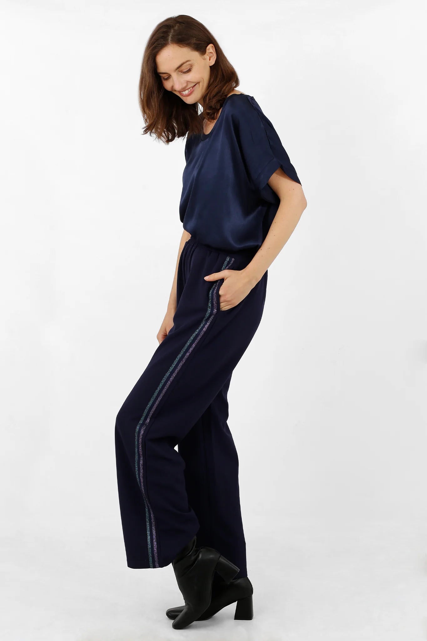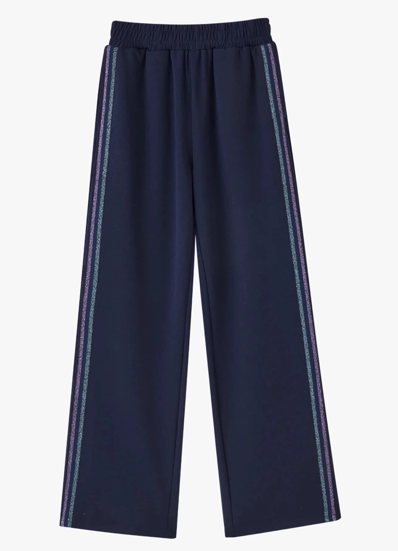 Estos elegantes pantalones rectos de color azul marino tienen una cinturilla elástica de talle alto que favorece el look y un detalle de rayas con purpurina azul a tono. Están rematados con bolsillos.