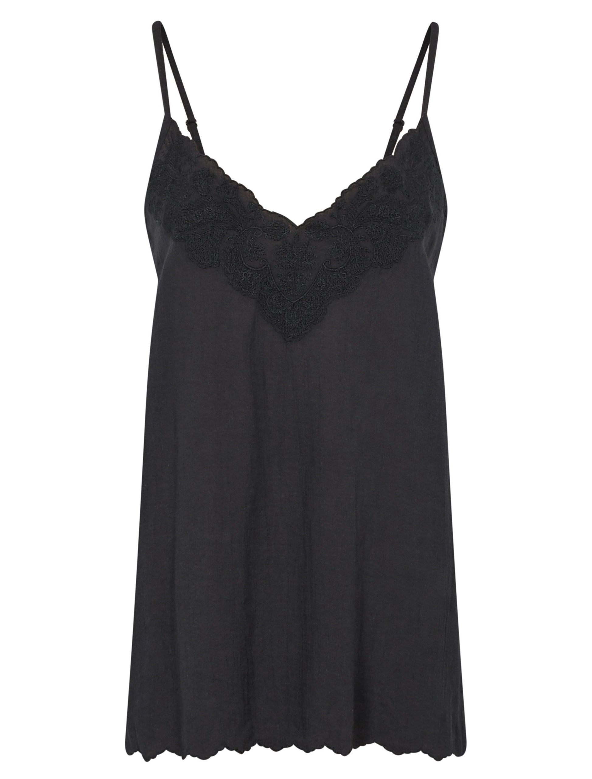 Esta hermosa camiseta de algodón negro descolorido con mangas cortas tiene un bonito bordado del mismo color alrededor del borde superior delantero.