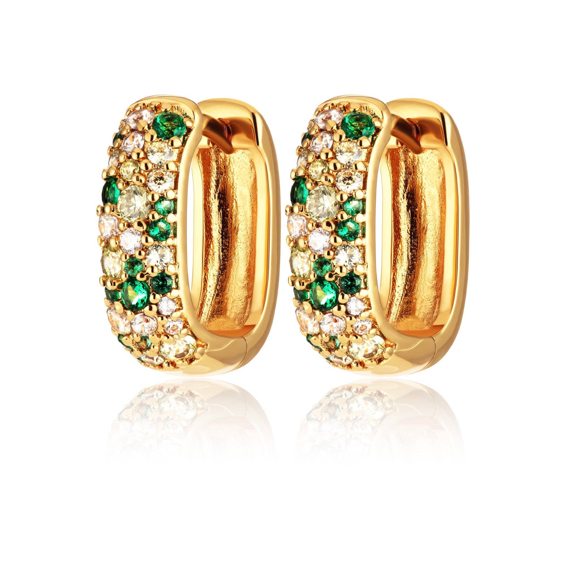 These gold mosaic chunky huggie hoop earrings are Stunning! . Featuring an extra chunky profile luxuriously studded with a mosaic of clear and vibrant green cubic zirconia stones in varying sizes. The strategic mix of stone colours in these gold large huggie earrings generates multi-dimensional light reflection, ensuring maximum visual appeal across different lighting conditions.