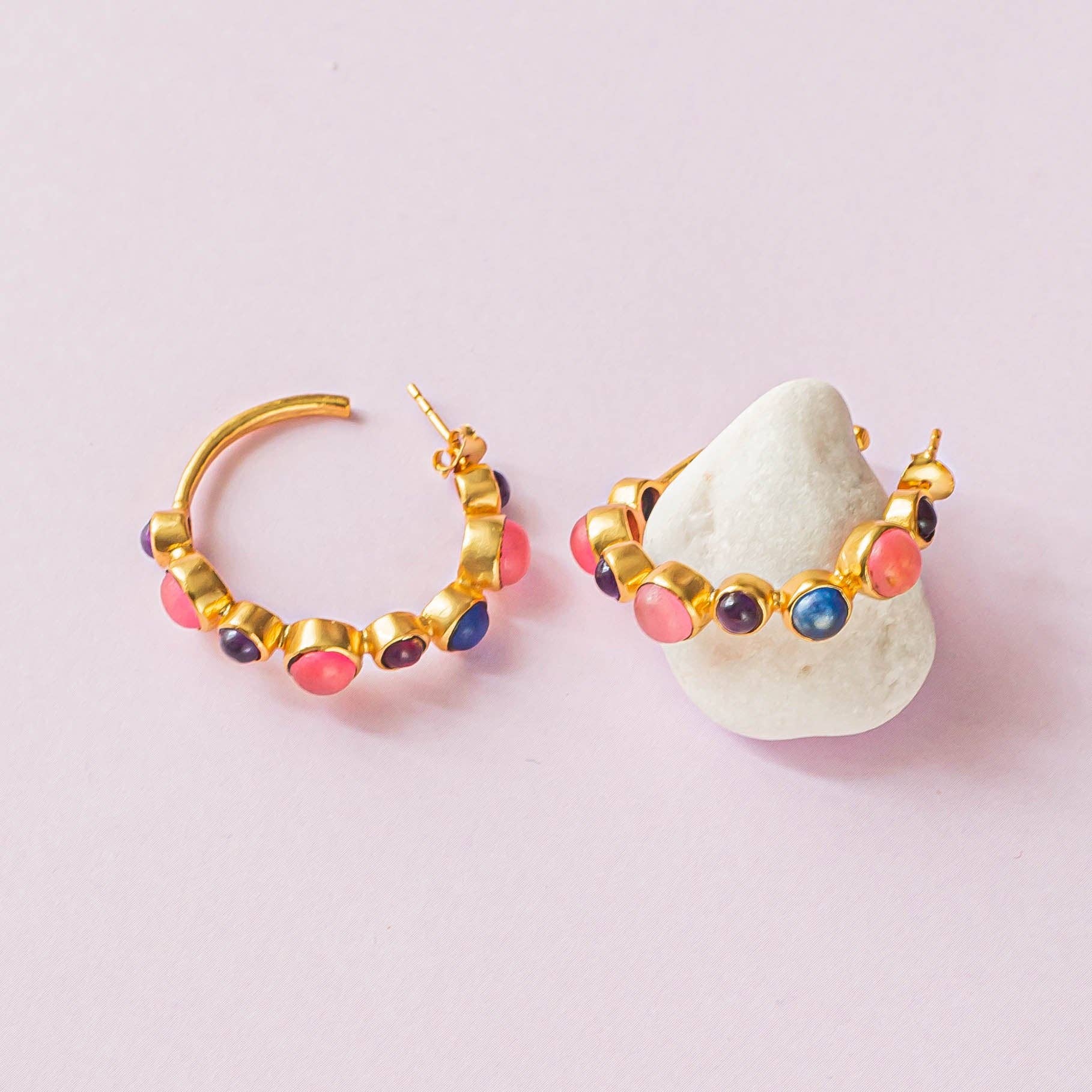 Gemstone set hoop earrings set with beautiful smooth gemstones in Pink jade, blue jade and amethyst - these are a true artisanal masterpiece.