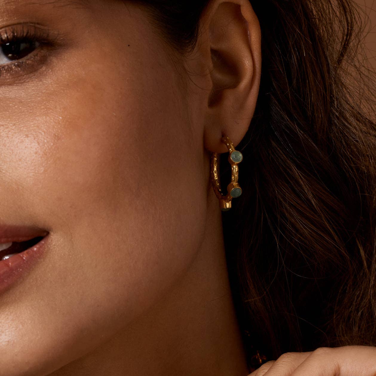 Gold hoop earrings with set aqua chalcedony gemstones Handcrafted by artisan jewellery makers and set with three tiny semi precious gemstones, these textured gold hoops suit any occasion, from home and work to holidays overseas.
