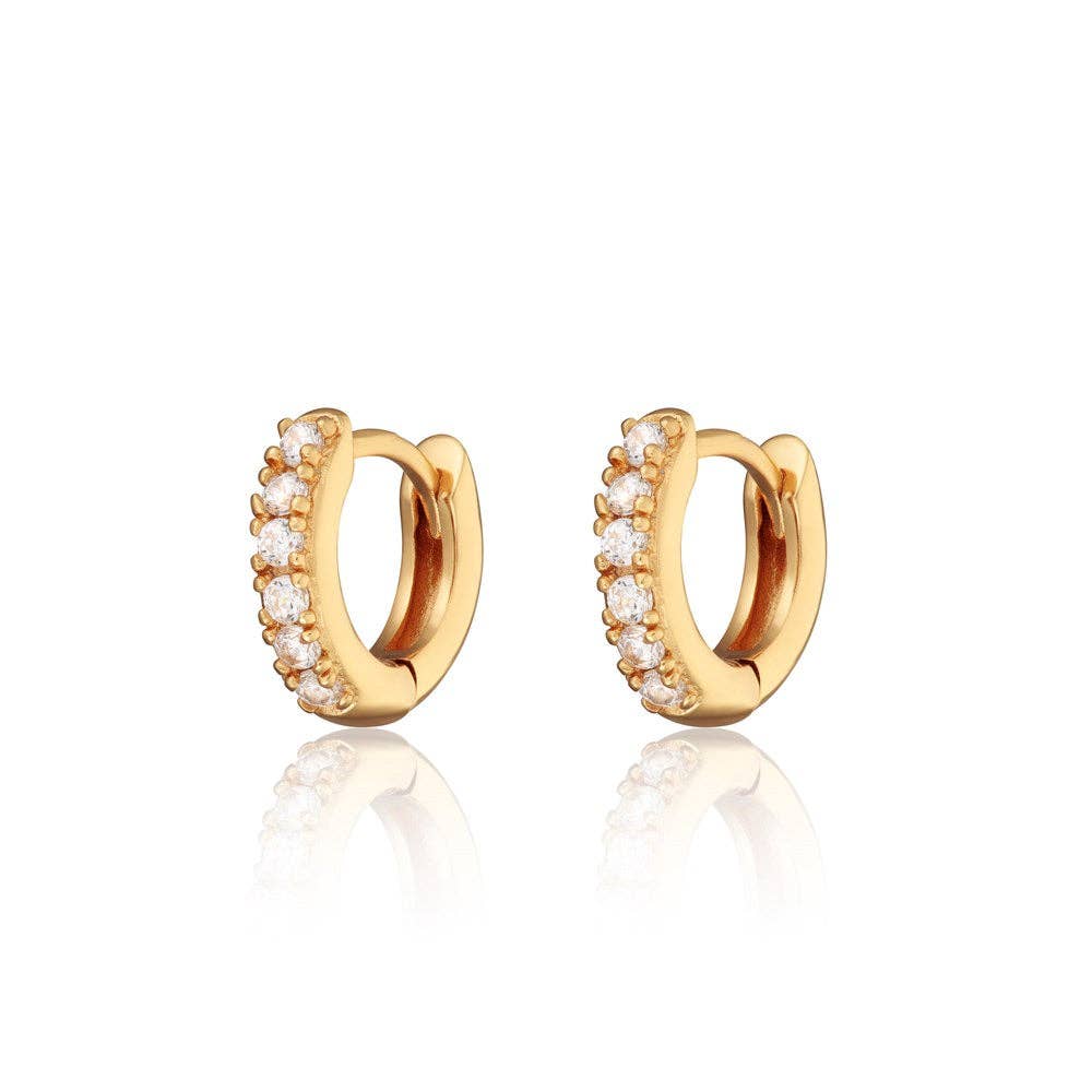 Talk about understated brilliance! These mini sparkling huggie hoops are adorned with clear cubic zirconia that catches the light beautifully. They hug the ear lobe perfectly and work whether you're going for that minimalist solo look or building up a full curated ear stack. Refined, elegant, and endlessly wearable