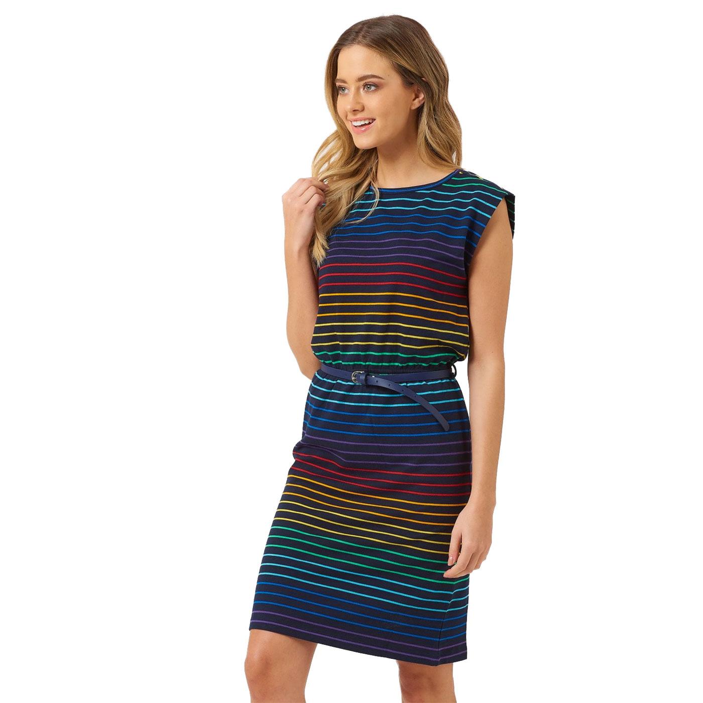 - Vestido de verano estilo retro de los años 70 con este fabuloso diseño retro de rayas triples de arcoíris. Azul marino oscuro con una llamativa raya fina de arcoíris retro. Corte favorecedor y fácil de llevar, con cintura ceñida y manga corta abierta. El vestido está rematado con un detalle en V en la parte posterior para añadir un toque extra.