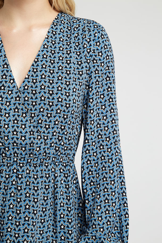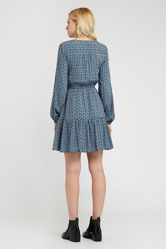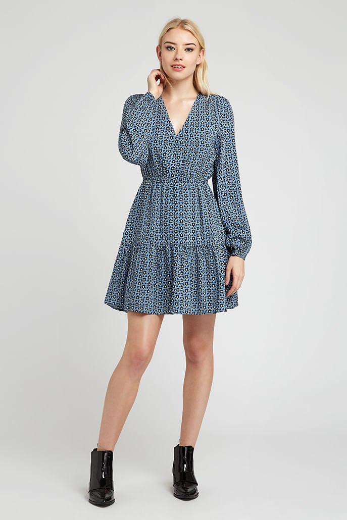 Conçue avec un imprimé géostar, cette petite robe est cool et séduisante. Avec sa coupe mini, sa jupe à volants et ses manches ballon légères créent un mouvement magnifique avec l'encolure en V et le corsage cache-cœur ajoutant une touche féminine. Portez-la avec des baskets pour la journée et des talons pour un rendez-vous galant. Enfilez un manteau camel oversize lorsque la température baisse.