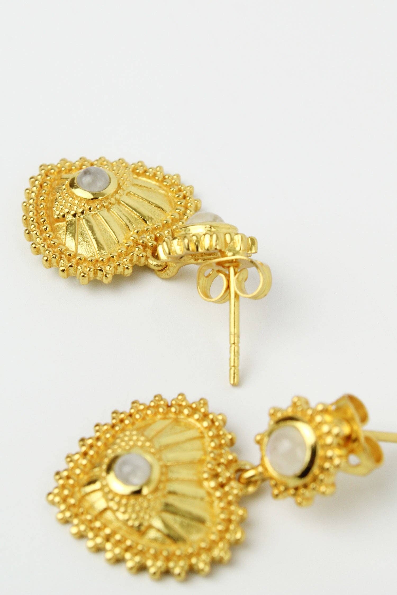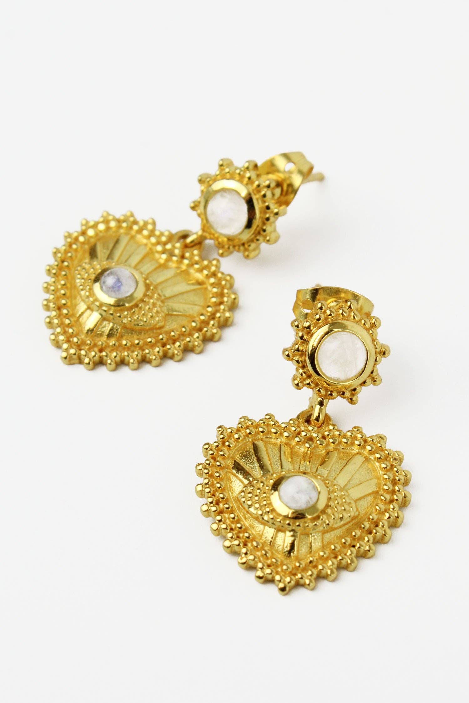 Beautifully made gold heart drop earrings adorned with crystal quartz stone.