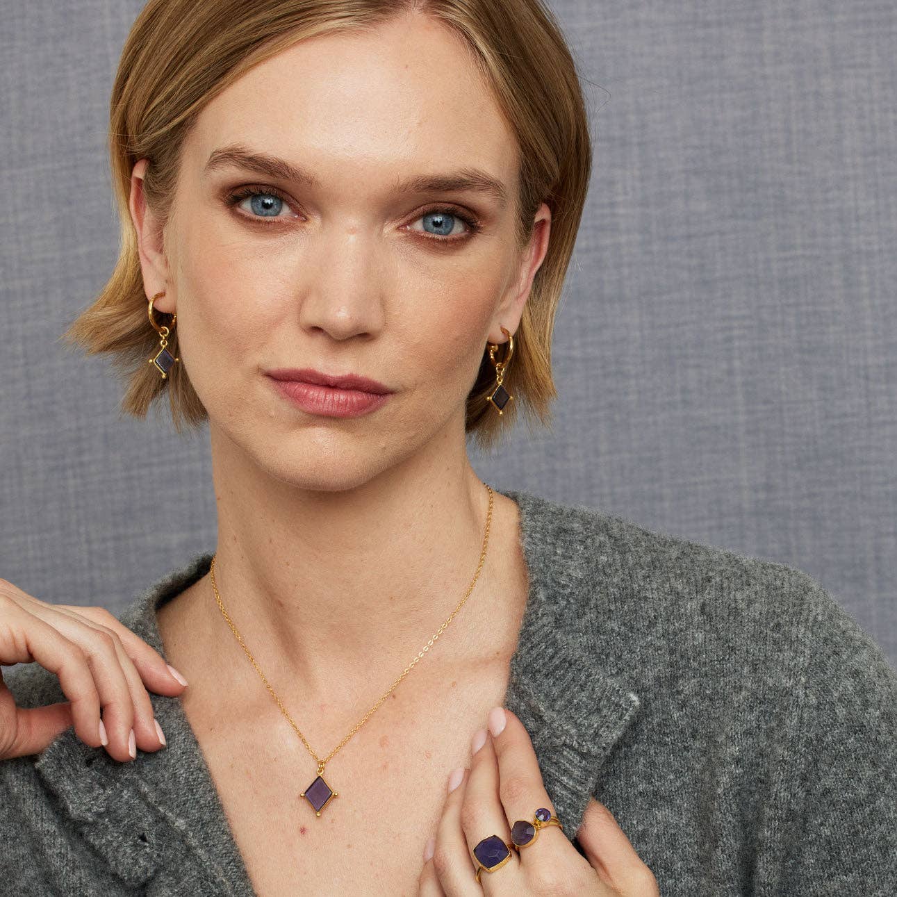 These hoop earrings feature a diamond-shaped navy blue iolite gemstone charm.